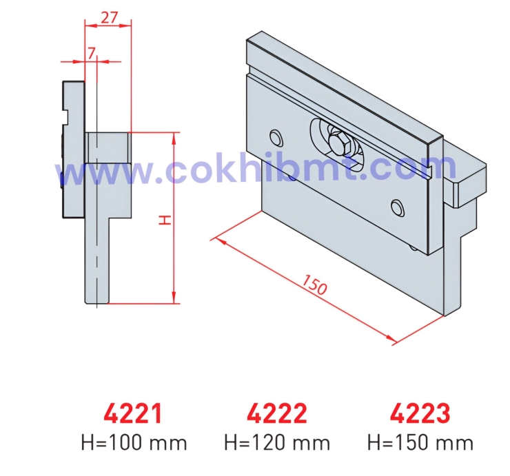 Dòng sản phẩm gồm 3 mã 4221, 4222 và 4223, khác nhau về chiều cao H, phù hợp với nhiều cấu hình máy chấn CNC khác nhau.