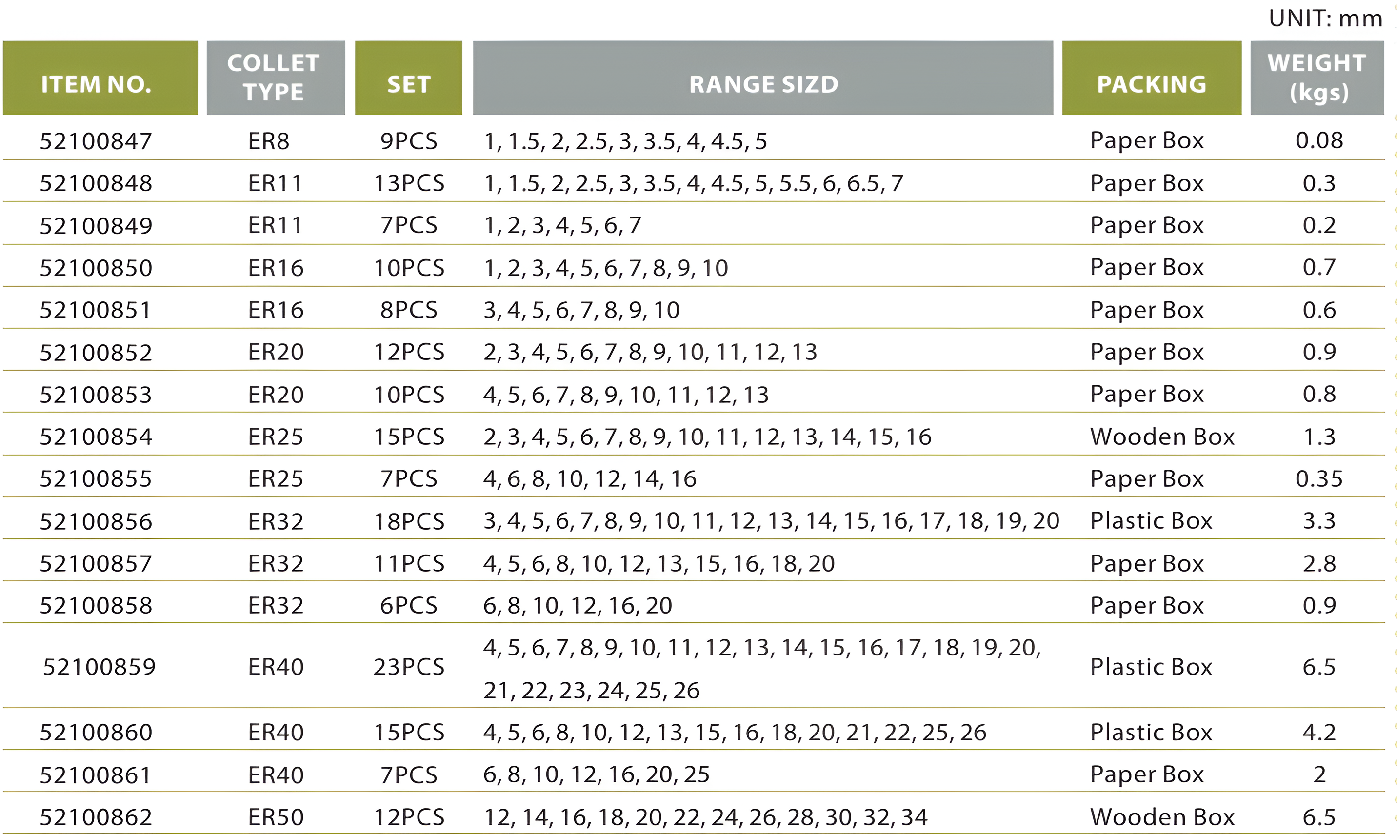 Bộ collet theo kích thước