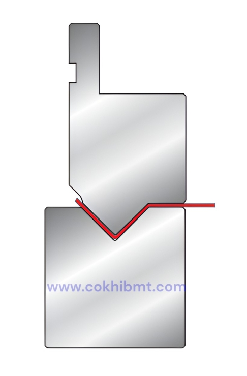 Khi dao đi xuống, vật liệu được dẫn hướng chính xác vào lòng cối, tạo ra nhiều góc gấp liên tiếp trong một lần chấn, đảm bảo các bước gấp có kích thước đồng đều và đúng.