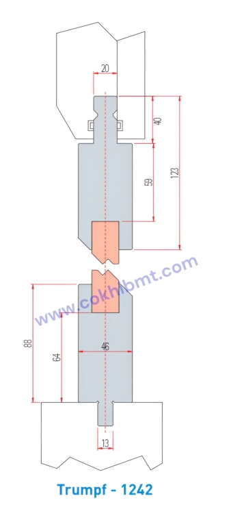 Bộ kẹp dao chấn Joggle Tool Holder 1150/1242 là phụ kiện chuyên dụng dùng để giữ và định vị insert dao chấn trong các nguyên công joggle, offset và chấn biên dạng đặc biệt trên máy chấn kim loại tấm. Thiết kế kẹp cứng vững giúp đảm bảo độ chính xác cao, an toàn khi vận hành và độ ổn định trong quá trình chấn lặp lại, phù hợp cho các dòng máy chấn phổ biến như Amada và Trumpf.