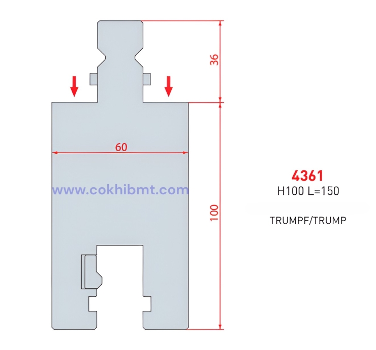 Bộ kẹp dudocjw thiết kế theo chuẩn kẹp nhanh, cho phép lắp đặt trực tiếp vào hệ kẹp hiện có của máy chấn CNC. Phần thân kéo dài giúp tăng khoảng hở giữa dao và bàn máy, hạn chế va chạm khi chấn các chi tiết lớn.