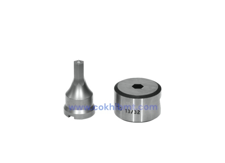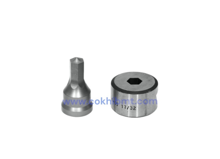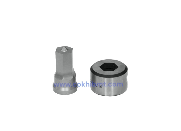 - Punch & Die được gia công chính xác theo biên dạng hex, đảm bảo lỗ đột đúng kích thước, các cạnh đều, góc rõ ràng và giảm thiểu tình trạng méo mó hoặc bo tròn góc.