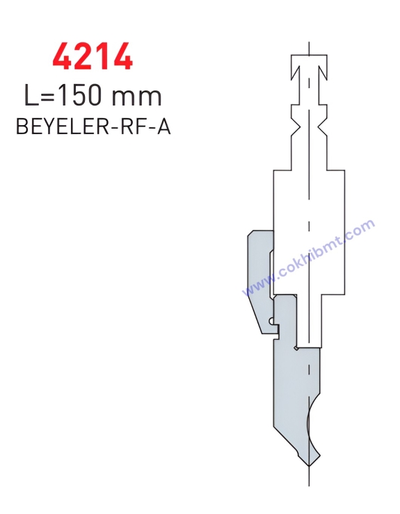 Đầu gá dao chấn 4214 – L=150 mm (BEYELER-RF-A) là phiên bản đầu gá có chiều cao làm việc lớn, hướng tới các ứng dụng chấn yêu cầu độ bám dao cao và độ ổn định lâu dài. Kiểu hình học RF-A với phần đầu khóa đặc trưng giúp tăng lực giữ, hạn chế trượt dao khi làm việc ở lực chấn lớn hoặc chu kỳ liên tục.