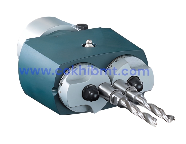 Đầu khoan 2 trục (2 – Spindle Boring Head) là thiết bị chuyên dụng dùng trong gia công cơ khí chính xác, cho phép khoan hoặc taro đồng thời hai lỗ trên cùng một chi tiết. Sản phẩm được thiết kế nhằm tăng năng suất, đảm bảo độ chính xác khoảng cách lỗ và tối ưu thời gian sản xuất, đặc biệt phù hợp cho gia công hàng loạt.