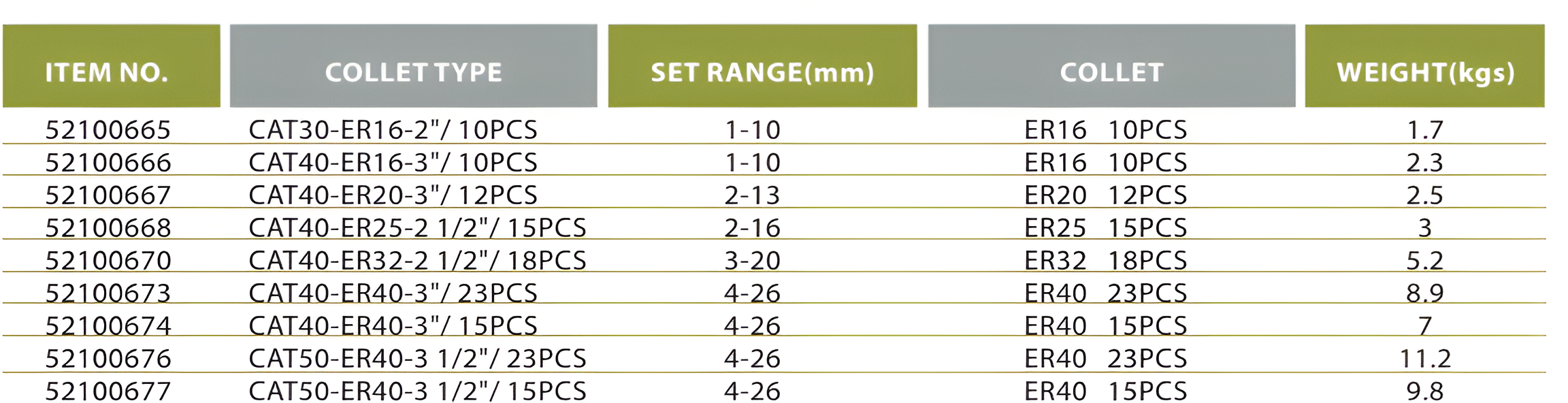 • ER32, ER40: đóng trong hộp nhựa