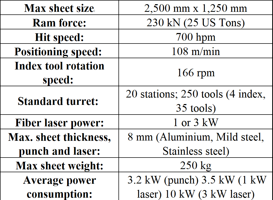 Máy được ứng dụng công nghệ đột dập servo – điện kết hợp laser sợi quang hiện đại, giúp tối ưu tiêu thụ năng lượng và chi phí vận hành. Công nghệ này mang lại độ chính xác cao, đường cắt sắc nét và khả năng gia công linh hoạt trên nhiều loại vật liệu kim loại tấm.