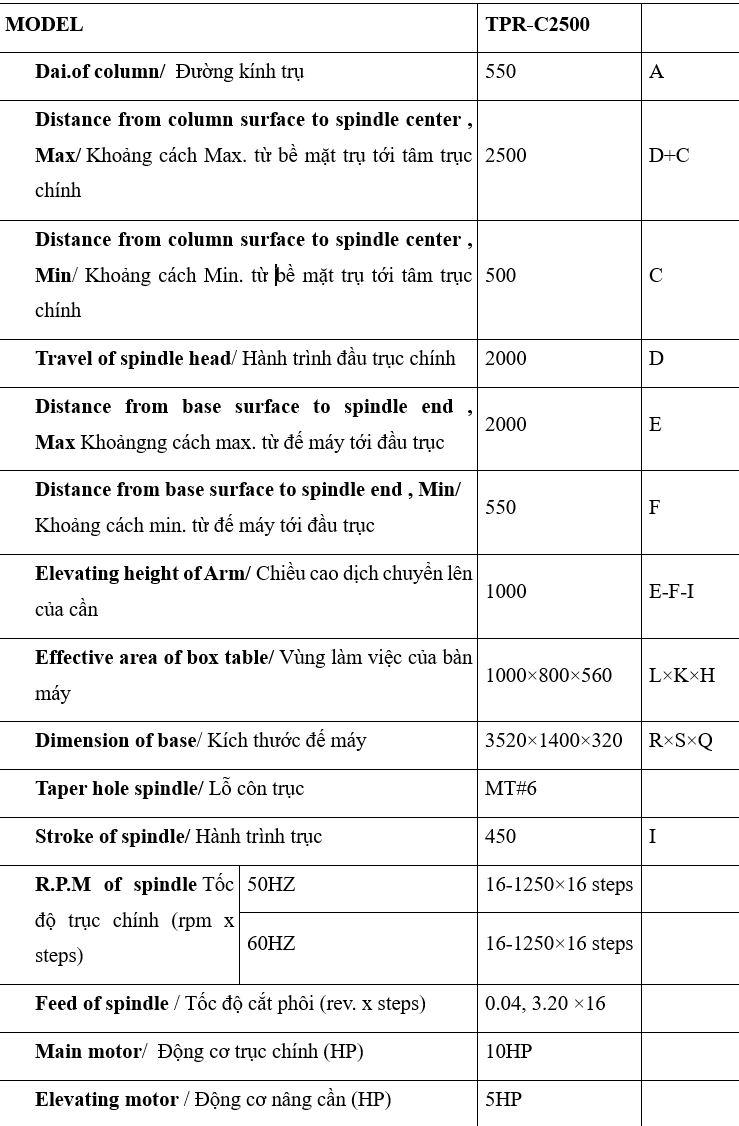 TPR-C2500 thuộc dòng máy khoan cần 80mm, có công suất, độ côn trục chính và hành trình khoan lớn hơn, giúp tăng hiệu suất và phạm vi gia công. Với cần khoan dài 2500mm, máy có bán kính làm việc rộng, phù hợp với các chi tiết cơ khí kích thước lớn.