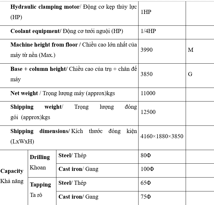 Máy có thể khoan lỗ trên thép φ80mm, khoan gang φ100mm, đồng thời ta rô trên thép φ65mm và ta rô trên gang φ75mm. Với khóa cần bằng thủy lực, công suất 10HP – 380V – 3 pha, máy đảm bảo hoạt động ổn định, mạnh mẽ và an toàn tuyệt đối trong quá trình làm việc.