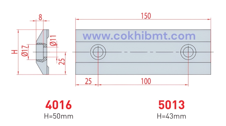 4016/5013 có kết cấu, chiều dài và vị trí lỗ lắp giống nhau, khác biệt chính nằm ở chiều cao H, giúp người dùng linh hoạt lựa chọn theo không gian lắp đặt và loại dao chấn sử dụng.