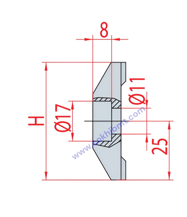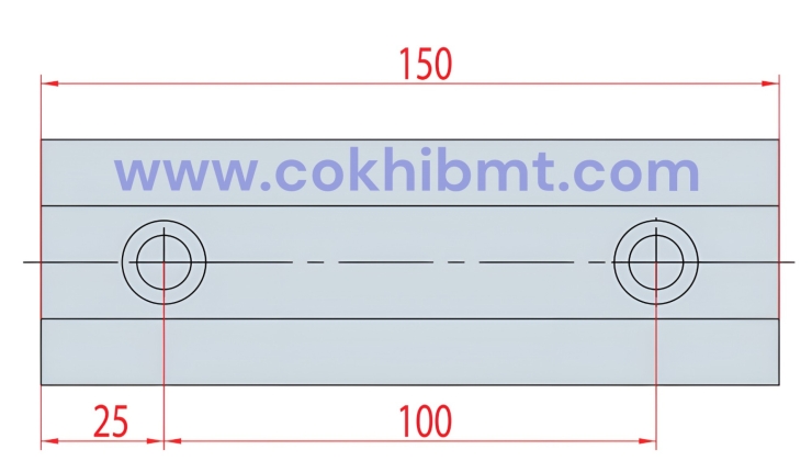 Khoảng cách tâm hai lỗ là 100 mm, lỗ đầu tiên cách mép thanh 25 mm, phù hợp với tiêu chuẩn lắp đặ phổ biến của nhiều dòng máy chấn hiện nay. Thiết kế lỗ kết hợp Ø11 và Ø17 cho phép sử dụng bulong tiêu chuẩn, dễ dàng tháo lắp, thay dao và bảo trì.